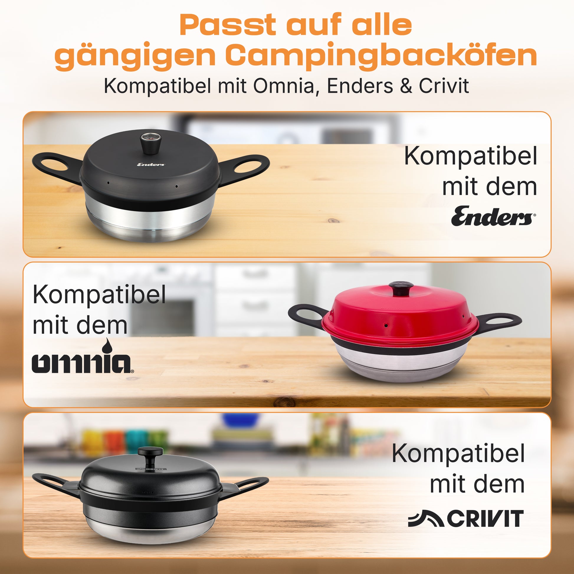 Ob Omnia, Enders Vamo oder Crivit – der Silikongriff passt auf viele gängige Camping-Backöfen und ist damit ein praktisches Zubehör für Outdoor-Köchinnen und -Köche.